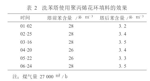 洗苯效果的好壞,關鍵取決于洗苯塔的結(jié)構和塔內(nèi)填料,因此選用合適的填料可以提高煤氣中粗苯的回收率,降低生產(chǎn)成本,保證裝置長周期運行。