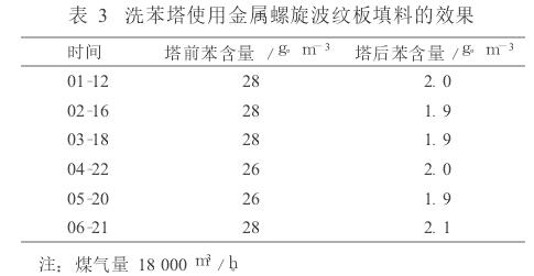 山西古縣錦華焦化廠  2 800mm× 3 000mm洗苯塔采用的是金屬螺旋波紋板填料,裝填填料99m 3,配套400kt/a焦化項目,填料總造價59.40萬元。自2005年投產(chǎn)至今,使用效果尚可,其主要缺陷在于填料造價太高。 2009年洗苯塔前、后苯含量如表3。